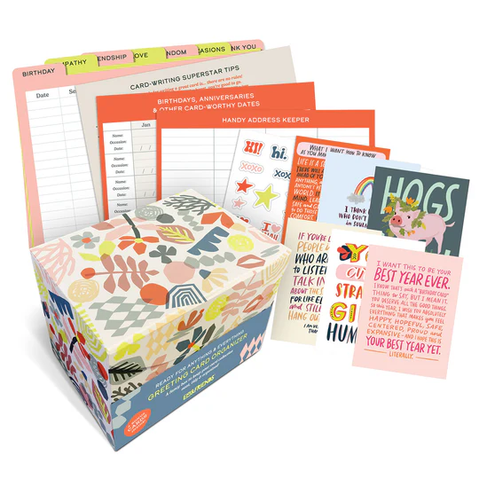 Hey, card lover! We created a box that’s like a file organizer for your cards, keeping ’em organized & safe from coffee spills & cat paws. Besides being cute and sturdy, it’s roomy enough for 60+ cards—and comes stocked with 6 Em & Friends greeting cards! Plus it’s got stickers, tabbed dividers, and a calendar for important dates! OH YEAH, plus an address keeper, trackers to log cards you’ve sent, and tips for writing cards! Did we forget anything? Hmmmmmm… Well, it doesn’t come with a nice warm mug of tea. We thought it might spill.